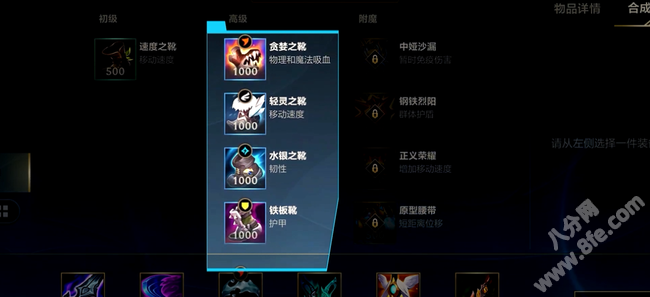 持续输出选提供吸血的贪婪之靴,前排根据敌方阵容选铁板靴或者水银之靴,需要技能加速选明朗之靴,对移速有更高需求的选轻灵之靴。