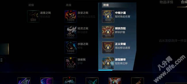 主动装备则是由鞋子合成而来,一级鞋除了能提供移速加成,有着一个主动释放的加速技能;二级鞋可以根据所选英雄需要选择不同属性的升级,