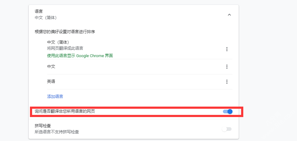 1、打开设置页-->高级-->语言,将“询问是否翻译非您所用语言的网页”开启,重启浏览器即可生效。