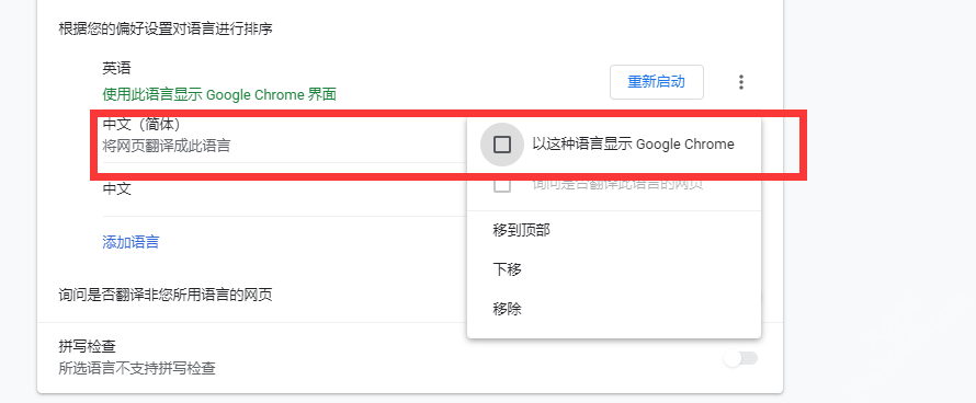 2、找到【中文(简体)-->右侧三个点-->移除简体中文】然后添加语言,找到【简体中文】勾选以这种语言显示,重启浏览器。